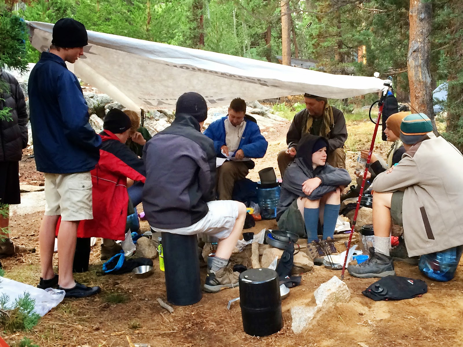They camped the first night in a meadow. It rained, so they huddled under a tarp to cook dinner