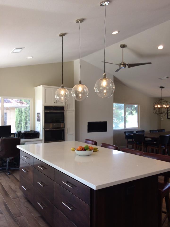 I tried several light bulbs until I found the perfect ones - antique, amber-tinted LED from Lowes. That little glass ball on the bottom is a nice touch. It ties in with the glass pendant lights above the island...